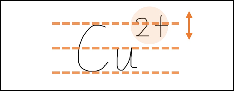 イオンを表す記号(+やーなど)は、元素記号の右上に、大文字の半分くらいの高さで書きましょう。